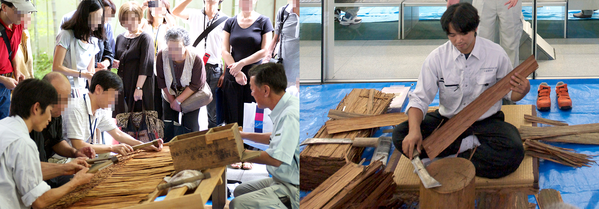 Under the guidance of the craftsman, you will experience the work of carefully layering the cypress skin one by one on a model of the cypress bark roof, and inserting bamboo nails one by one with a roof hammer and fixing them. You can also see how skilled craftsmen prepare cypress bark as a material, and how thin boards used for kokerabuki are split one by one. Please take a closer look at the world of traditional techniques that you can't usually see.