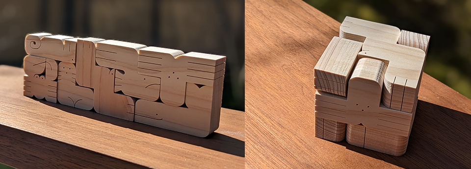 We make three-dimensional puzzle of braided wood designed by Kumiki writer Saburo Koguro with electric thread saw.